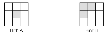 (Hình B chia thành 9 ô vuông nhỏ bằng nhau, nhưng tô màu 3 ô vuông.)