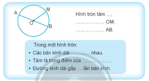 Học sinh quan sát hình vẽ để xác định tâm, bán kính, đường kính và viết vào chỗ chấm