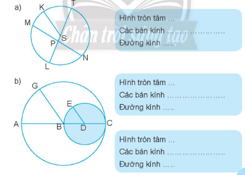 Học sinh quan sát hình vẽ và dựa vào kiến thức bên trên để kể tên tâm, các bán kính và đường kính của mỗi hình tròn.