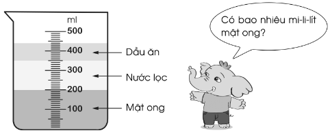 c) Bình đo đang đựng tất cả bao nhiêu mi-li-lít gồm mật ong, nước lọc và dầu ăn?