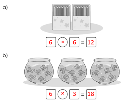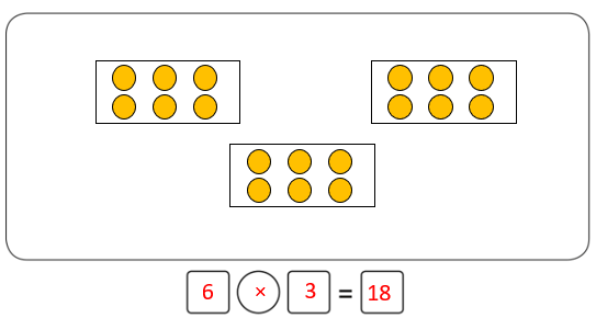 Vậy phép nhân để tìm tất cả số chấm tròn nói trên là: 6 × 3 = 18 (chấm tròn)