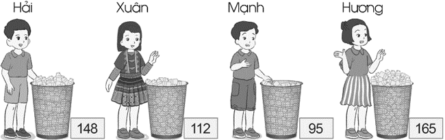 b) Sắp xếp các số trên theo thứ tự từ lớn đến bé, ta được: 165; 148; 112; 95. Tương ứng với số lượng chai nhựa thu gom được lần lượt của các bạn: bạn Hương, bạn Hải, bạn Xuân, bạn Mạnh