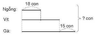 Đàn ngỗng có 18 con, đàn vịt có số con vịt gấp đôi đàn ngỗng, đàn gà có nhiều hơn đàn vịt là 15 con. Hỏi cả 3 đàn có tất cả bao nhiêu con?