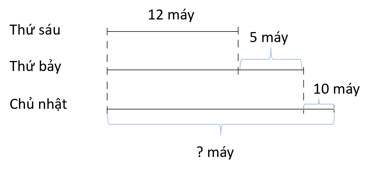 Một cửa hàng, ngày thứ Sáu bán được 12 máy tính, ngày thứ Bảy bán được nhiều hơn ngày thứ Sáu 5 máy tính, ngày Chủ nhật bán được nhiều hơn ngày thứ Bảy 10 máy tính. Hỏi ngày Chủ nhật cửa hàng đó bán được bao nhiêu máy tính?