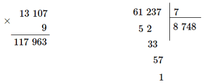 | Thử lại: 117 963 : 9 = 13 107 | Thử lại: 8 748 × 7 + 1 = 61 237 |
