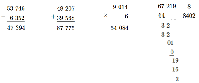 | 53 746 – 6 352 | 48 207 + 39 568 | 9 014 × 6 | 67 219 : 8 |