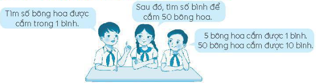 Mẫu: Cắm đều 20 bông hoa vào 4 bình hoa. Hỏi có 50 bông hoa thì cắm được bao nhiêu bình hoa như thế?
