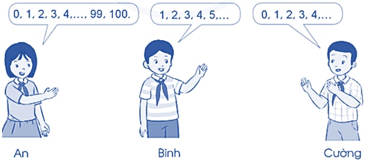 Ba bạn An, Bình và Cường đang tranh luận xem đâu là dãy số tự nhiên. Theo em, bạn nào đúng?