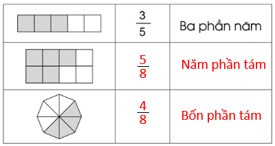 \(\frac{5}{8}\) có tử số là 5, mẫu số là 8