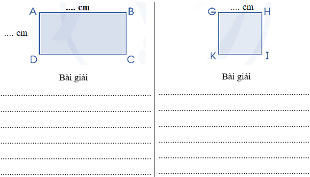 Bài giải: Chu vi hình vuông GHIK là: 3 × 4 = 12 (cm) Diện tích hình vuông GHIK là: 3 × 3 = 9 (cm2) Đáp số: chu vi: 12cm diện tích: 9cm2 |