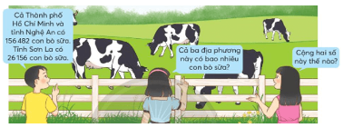 Quan sát hình vẽ phần Khởi động trong SGK rồi viết phép tính để tìm số con bò sữa của cả ba địa phương.