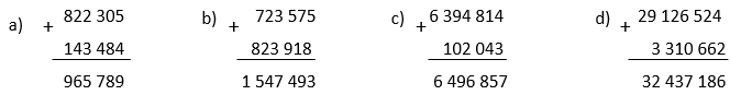a) 822 305 + 143 484 c) 6 394 814 + 102 043 |