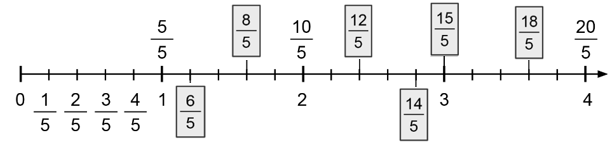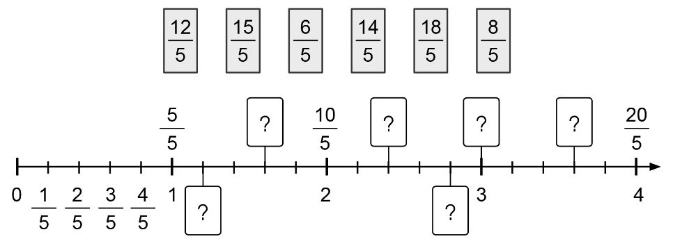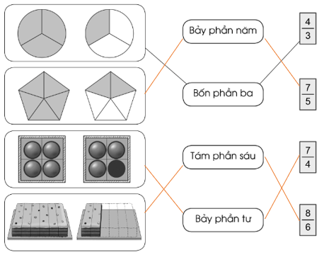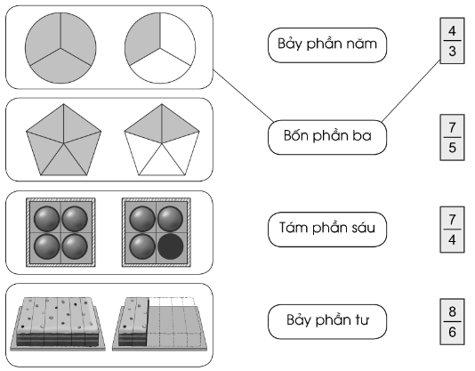 Nối các thẻ ghi phân số vào vị trí thích hợp trên tia số: