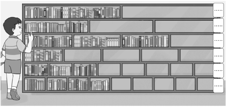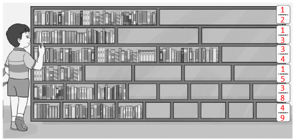 Viết phân số chỉ phần đã xếp đầy sách trong mỗi hàng của giá sách dưới đây.