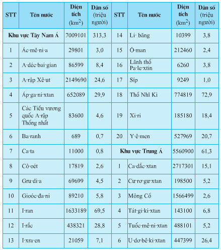 DIỆN TÍCH, DÂN SỐ CÁC QUỐC GIA Ở KHU VỰC TÂY NAM Á VÀ KHU VỰC TRUNG Á – NĂM 2005