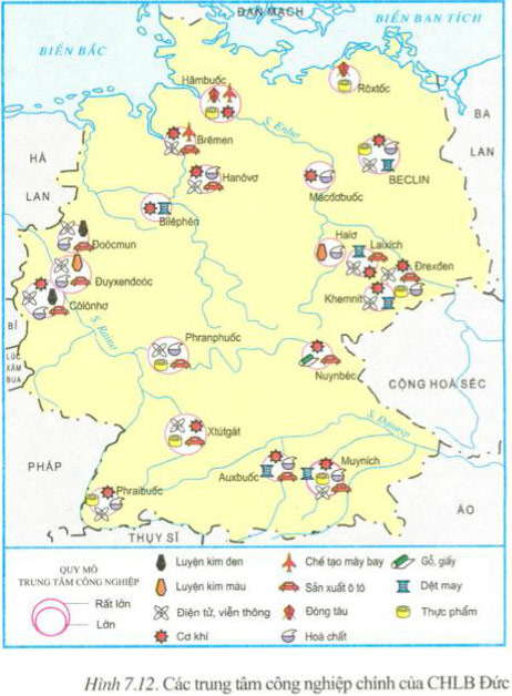 Dựa vào hình 7.12, hãy xác định các trung tâm công nghiệp: Cô-lô-nhơ, Phran-Phuốc, Muy-ních, Xtút-gát, Béc-lin và các ngành công nghiệp của những trung tâm đó.