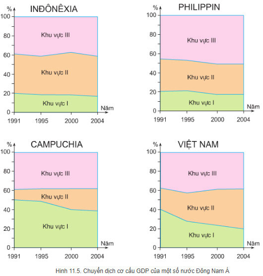 Dựa vào hình 11.5, nhận xét về xu hướng thay đổi cơ cấu GDP của một số quốc gia Đông Nam Á.